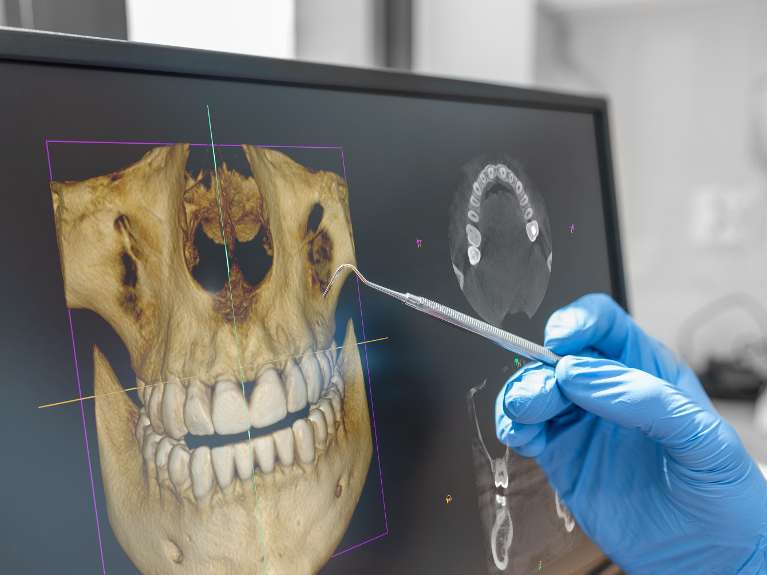 We utilize a CBCT x-ray machine to visualize the top and bottom jaws in three dimensions. This technology allows us to check for bony pathology or tooth infections and analyze the available airway space in the nose and throat. If the airway space shows up constricted on the CBCT, it indicates a predisposition for Obstructive Sleep Apnea.